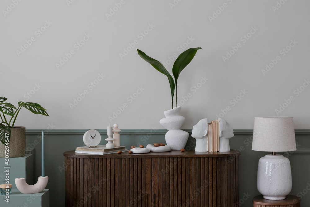 Interior design of cozy living room interior with wooden sideboard stylish lamp, modern sculpture, plants and personal accessories. Home decor. Template.