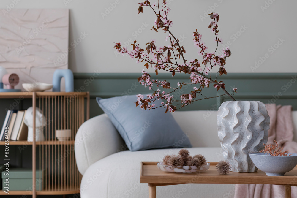 Cozy living room interior with mock up poster frame, boucle sofa, modern sculpture, stylish vase with flowering branches, blue pillow and personal accessories. Home decor. Template.