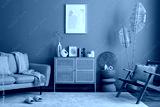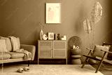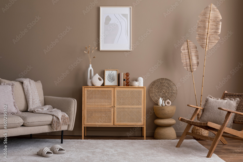Creative composition of living room interior with mock up poster frame, rattan sideboard, beige sofa, bright carpet, wooden armchair, stylish lamp and personal accessories. Home decor. Template.