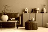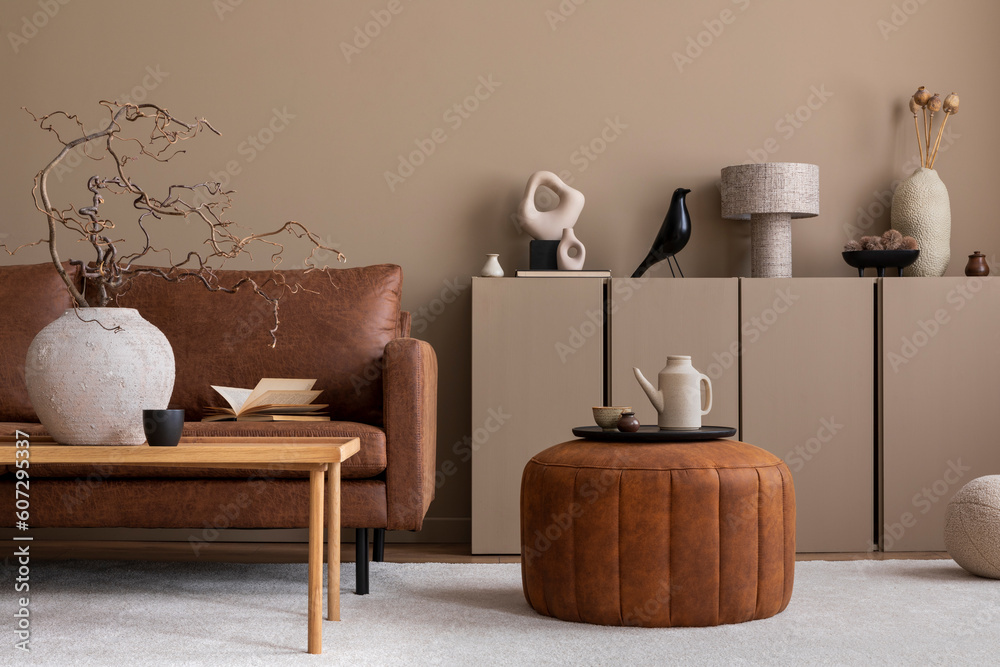 Warm and cozy living room interior with brown sofa, wooden coffee table, round pouf, vase with branch, beige sideboard, pitcher, cup, books and personal accessories. Home decor. Template.