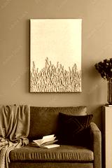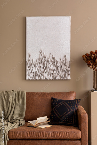 Aesthetic composition of cozy living room interior with mock up poster frame, brown sofa, patterned pillow, gray plaid, vase with branch and personal accessories. Home decor. Template.