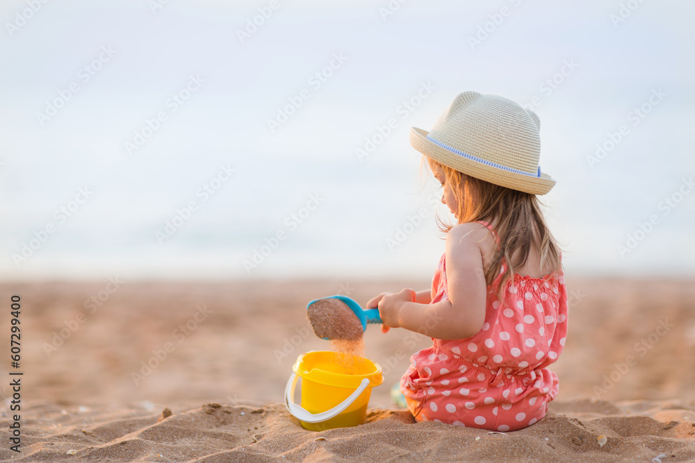 baby girl is sitting on beach and playing in sand in summer. holidays with children