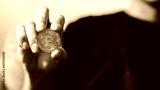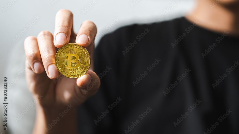 Hand holding golden bitcoin cryptocurrency electronic virtual Decentralize money..