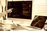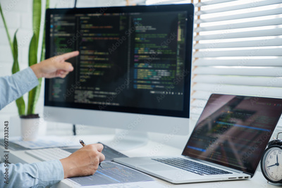 programmer writing program code with two monitors Programmer analysis working with software code solving problems. developing software applications in the office