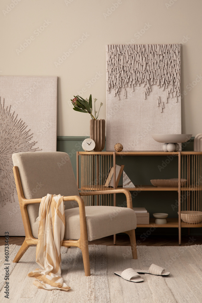 Interior design of spring living room interior with mock up poster frame, wooden sideboard, gray armchair, slippers, plaid, vase with flowers, beige rug and personal accessories. Home decor. Template.