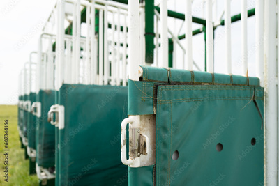 Shallow focus of a race horse starting gantry showing the entry for the horse and jockey. Used to train race horses for militarily to the equipment.