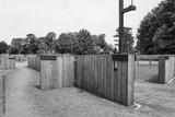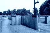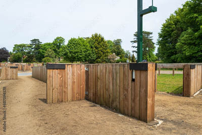Race horse queuing barrier seen at the famous Newmarket, Suffolk, UK training ground. Horses line up to cross the distant body road.