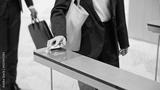 エントランスゲートを通るビジネスパーソン