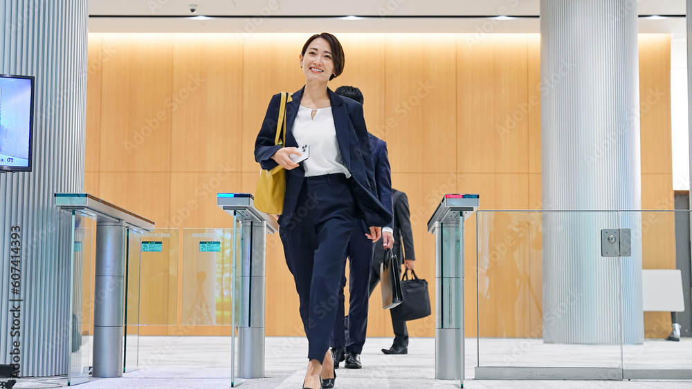 エントランスゲートを通るビジネスパーソン