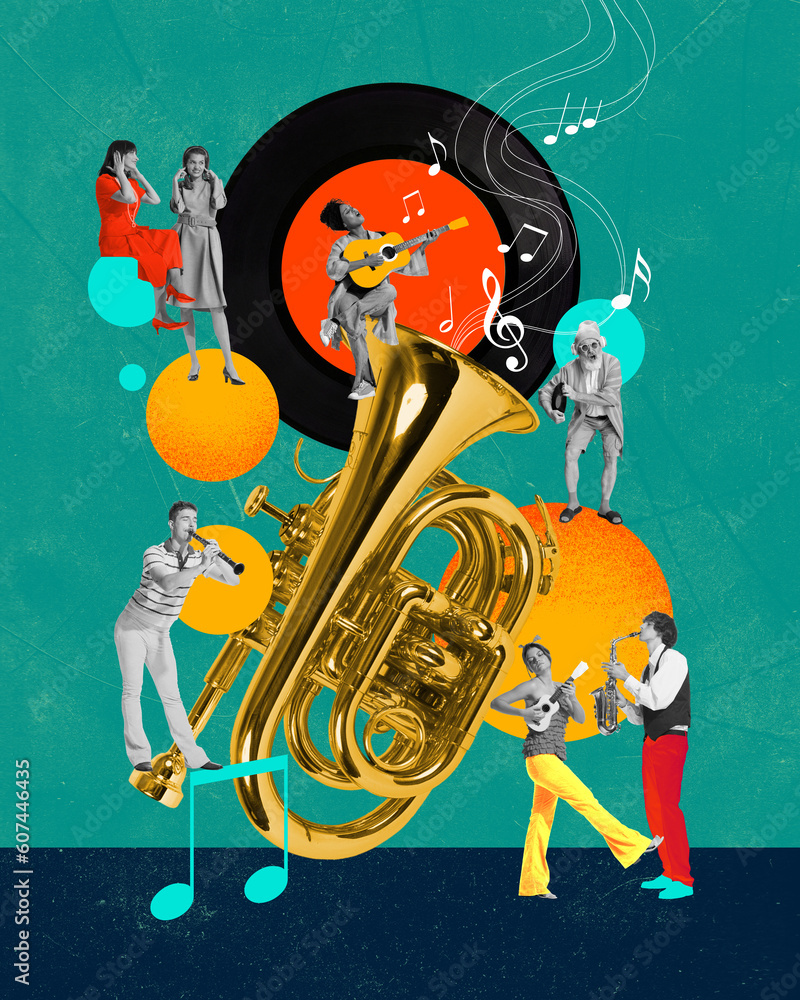 Group of talented, artistic people playing on diverse music instruments, singing. Authentic party. Contemporary art collage. Music, lifestyle, art of sound, performance concept. Creative bright design