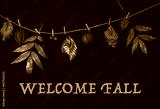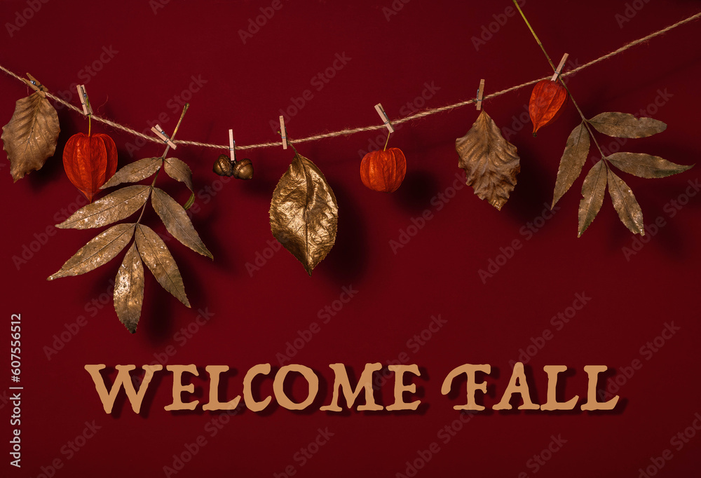 Text Welcome Fall. Garland of autumn bronze leaves and orange physalis on a burgundy background.