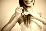 Woman, haircare and studio with oil, health and drop for wellness, self care and growth by brown background. Young model, girl and smile for healthy hair care, results and treatment for split ends