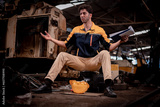 Worker wearing uniform sitting in factory plantation posing feel tried and serious with work ,he holding work document on hand feel high presser situation is failure workplace.