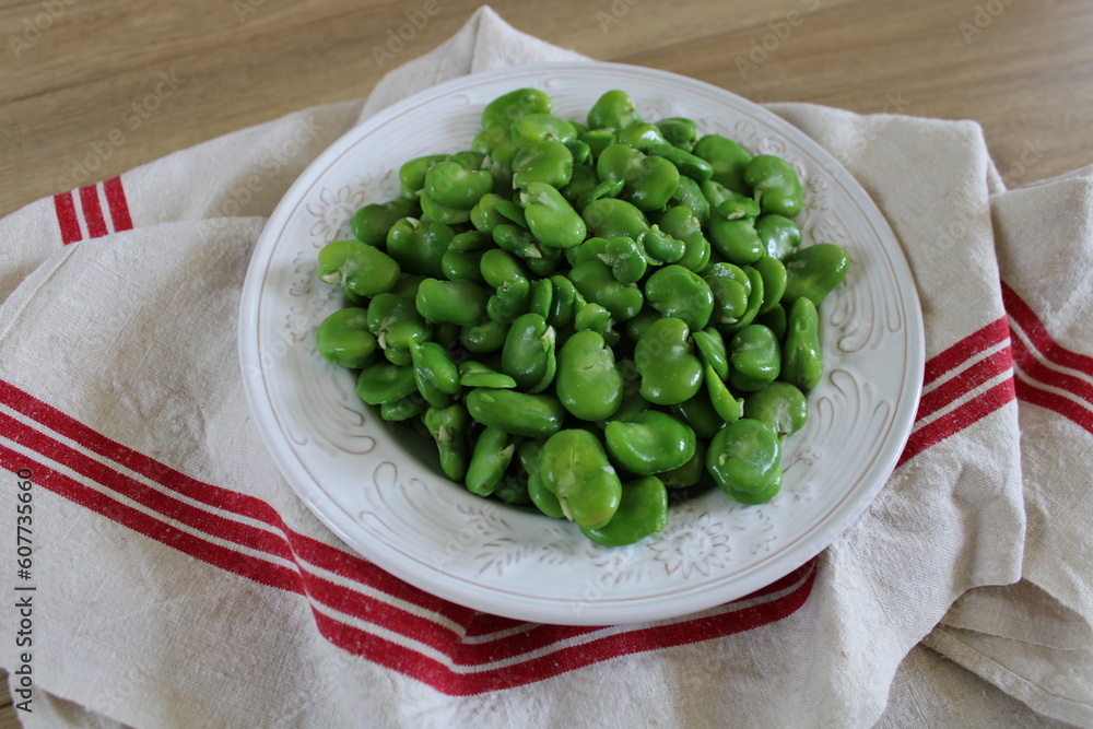 Fèves pelées, sans les gousses, recette de cuisine et aliment frais.