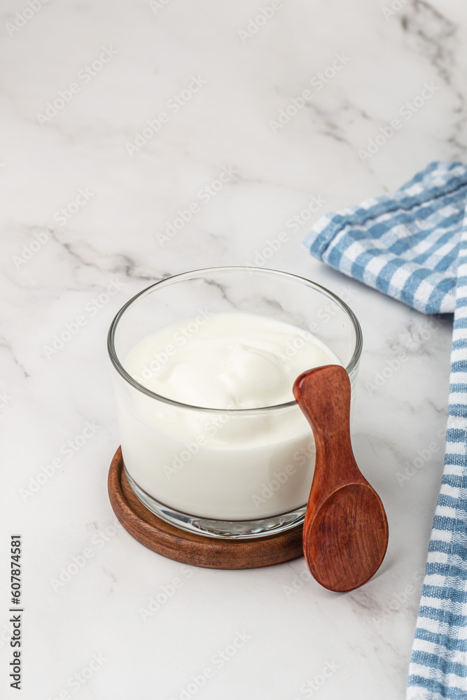 A bottle of milk and glass of yogurt, kefir, fermented milk, Probiotic cold fermented dairy drink. top view