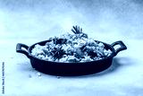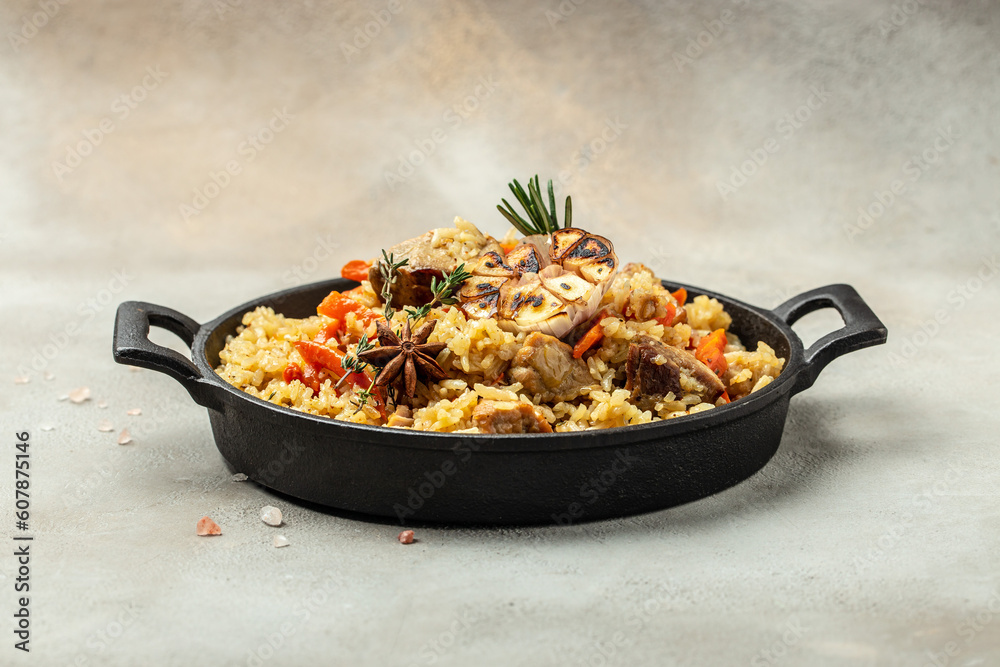 Uzbek pilaf in cast-iron pan. banner, menu, recipe place for text, top view