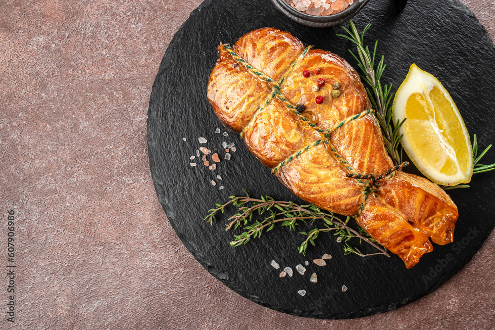 Delicious fried salmon fillet, Healthy fats, clean eating for weight loss. top view. place for text