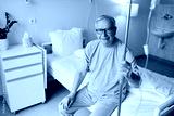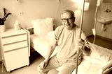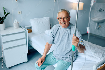 Happy senior patient with IV drip recovering in hospital and looking at camera.