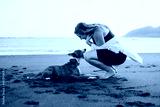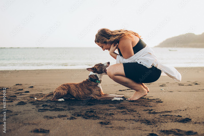 woman petting her dog on the beach