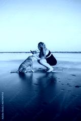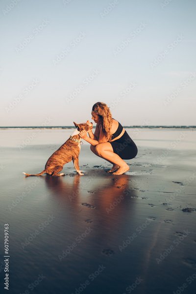 woman petting her dog on the beach