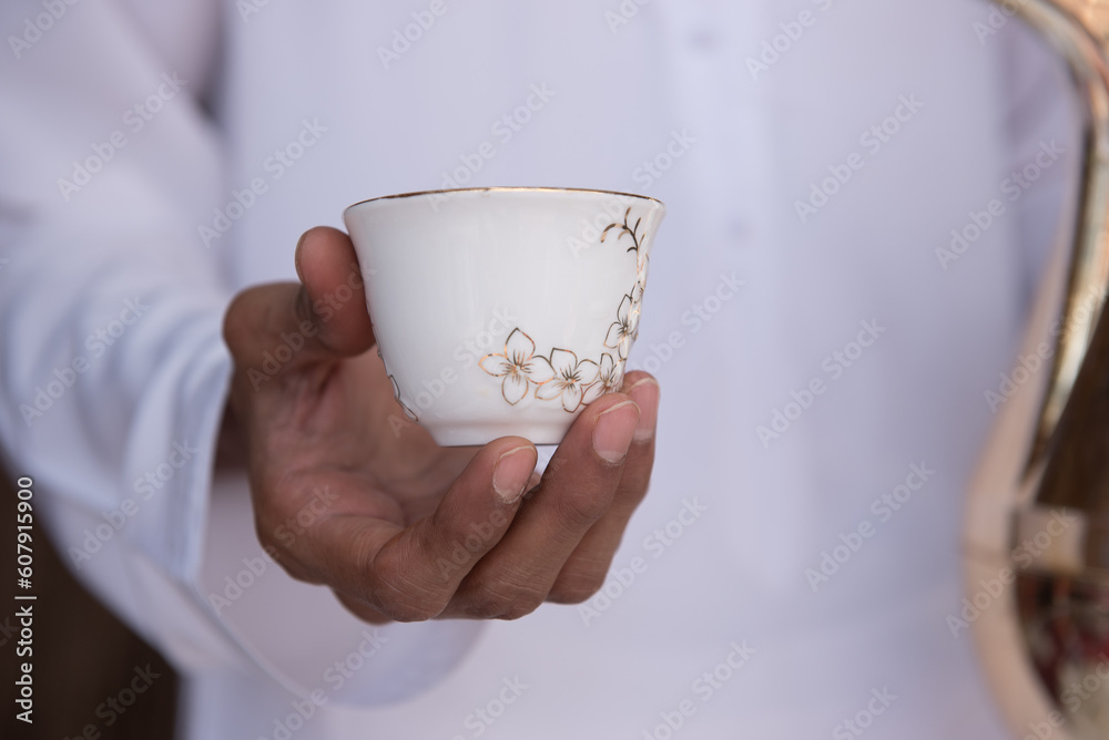 a man holding an arabian coffe cup