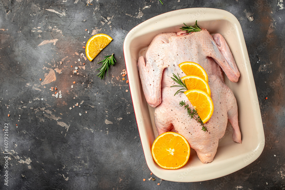 Fresh raw duck with orange thyme and spices on a dark background. Culinary cooking. banner, menu, recipe place for text, top view