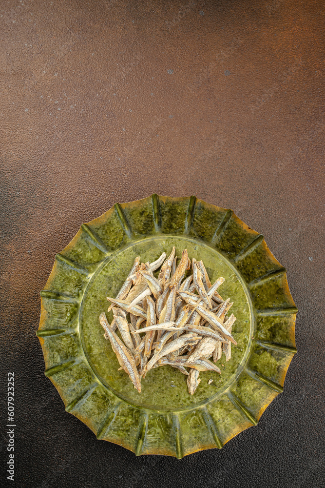 Saltwater fish of the anchovy on a dark background. place for text, top view