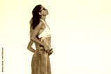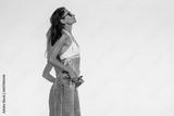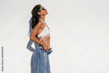 brunette girl in glasses in a white swimsuit and blue jeans against a white wall