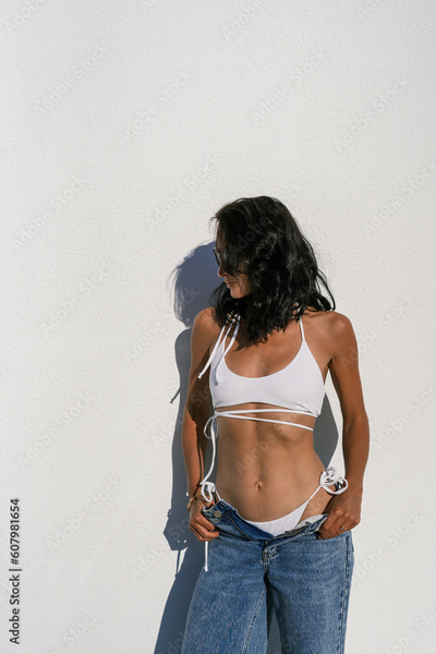 brunette girl in glasses in a white swimsuit and blue jeans against a white wall