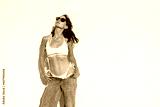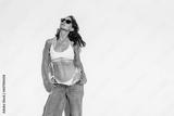 brunette girl in glasses in a white swimsuit and blue jeans against a white wall