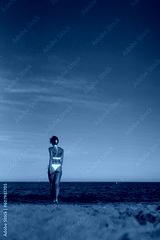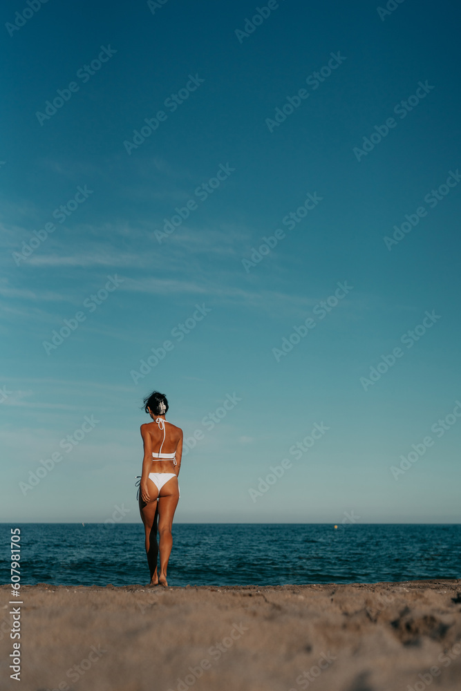 brunette girl in glasses in a white swimsuit on the sand against the background of the sea