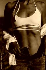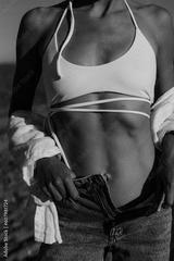 brunette girl in glasses in a white swimsuit and blue jeans on the background of the sea