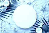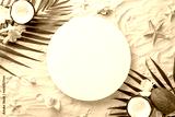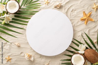 Embrace the vibes of summer holidays with a stunning top view scene: shells, starfish, palm leaves, coconut, exotic flowers set against sandy shore backdrop, complete with empty circle for text or ad