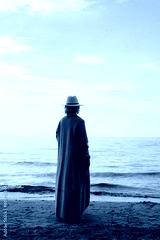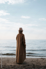 Lonely senior woman alone standing on seashore and looking thoughtfully into horizon. Back view of stylish elderly beautiful lady wearing hat, brown coat, mood of loneliness in nature