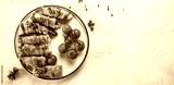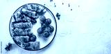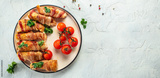 Chicken rolls wrapped in bacon. Delicious balanced food concept. Long banner format. top view