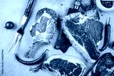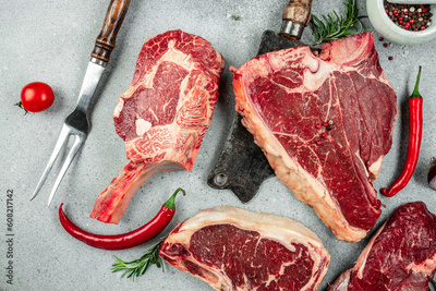 Variety of fresh Black Angus Prime raw beef steakes on a light background. banner, menu, recipe place for text, top view