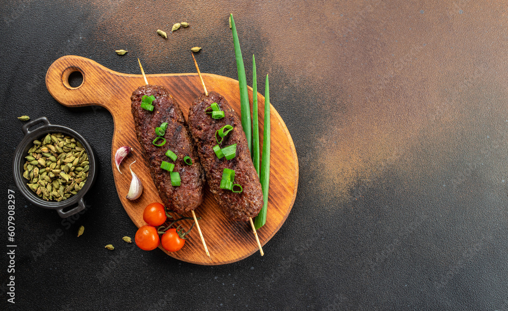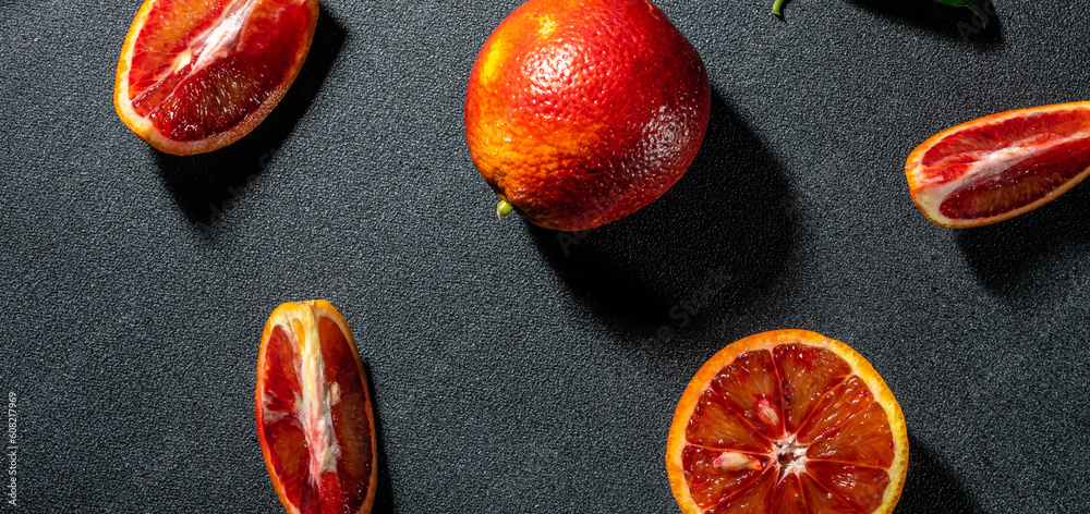 Whole and sliced sicilian oranges on a dark background. Long banner format. top view
