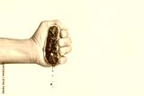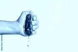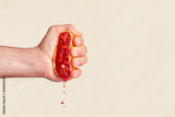 Hand squeezes orange juice. Freshly squeezed red bloody orange juice