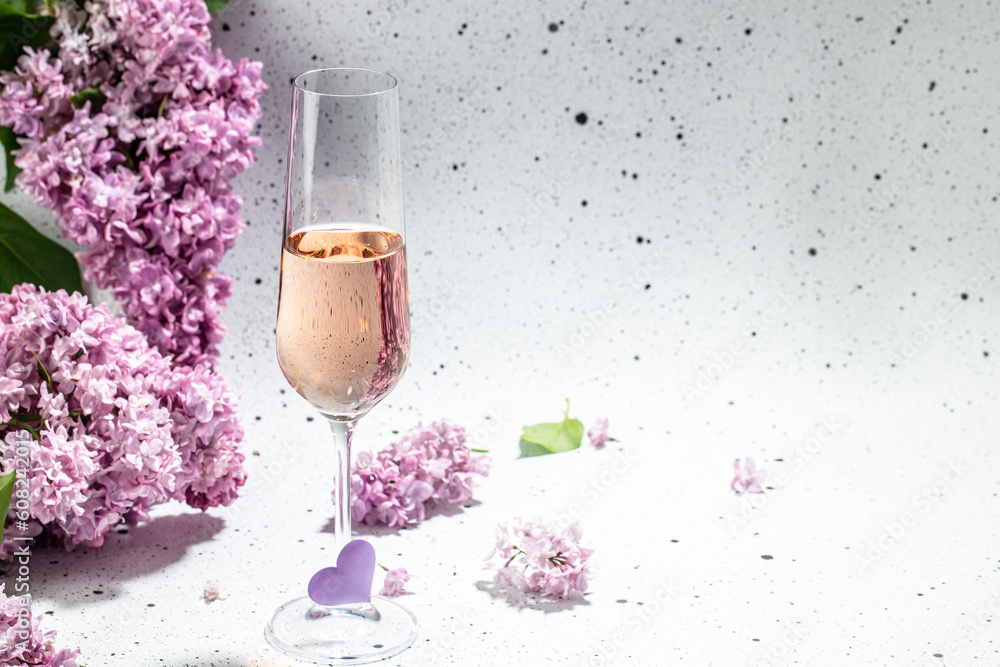 Rose wine and lilac flowers0. Summer celebration, wedding greeting card, invitation concept. Long banner format