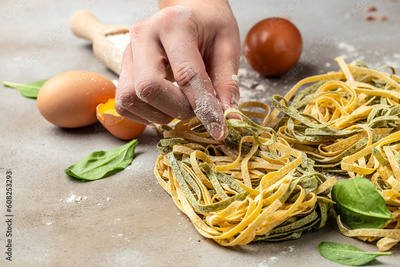 Raw homemade spinach pasta with spinach leaves. homemade italian pasta pappardelle, fettuccine or tagliatelle