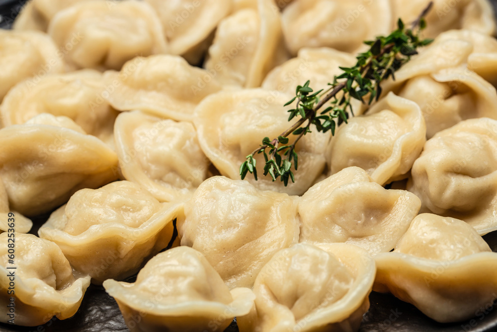 Homemade meat dumplings pelmeni. Dumplings, filled with meat, ravioli in bowl. Restaurant menu, dieting, cookbook recipe top view