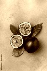Passion fruits on dark background. Set of whole and half of fresh passion fruit. place for text, top view
