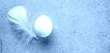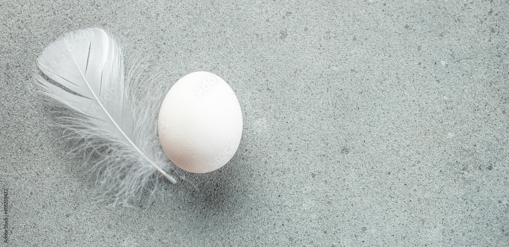 white egg with chicken feathers. banner, menu, recipe place for text, top view