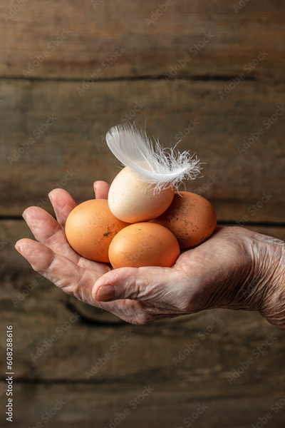 A woman takes chicken eggs from the nest. Concept of agriculture, bio and eco farming, bio food products. place for text