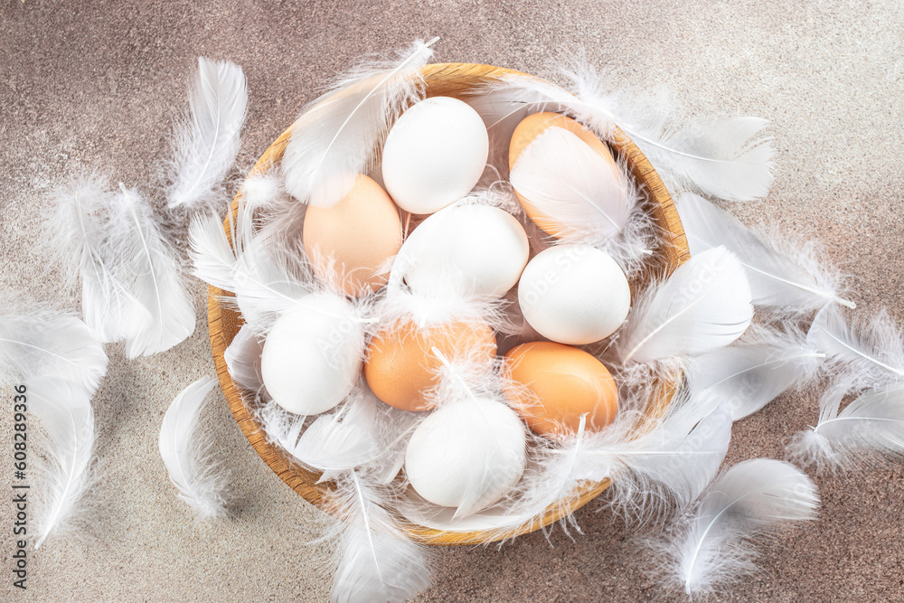 raw brown eggs and white eggs with chicken feathers. Concept of agriculture, bio and eco farming, bio food products. place for text