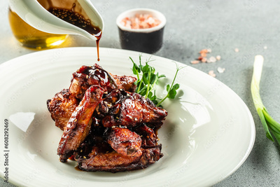 Roasted chicken wings in barbecue sauce with sesame seeds