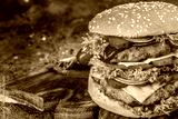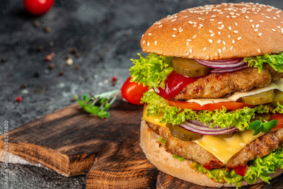 home made tasty burger cheese slice, tomato, onion,lettuce, mayonnaise, white bun, Fat unhealthy food. banner, menu, recipe place for text