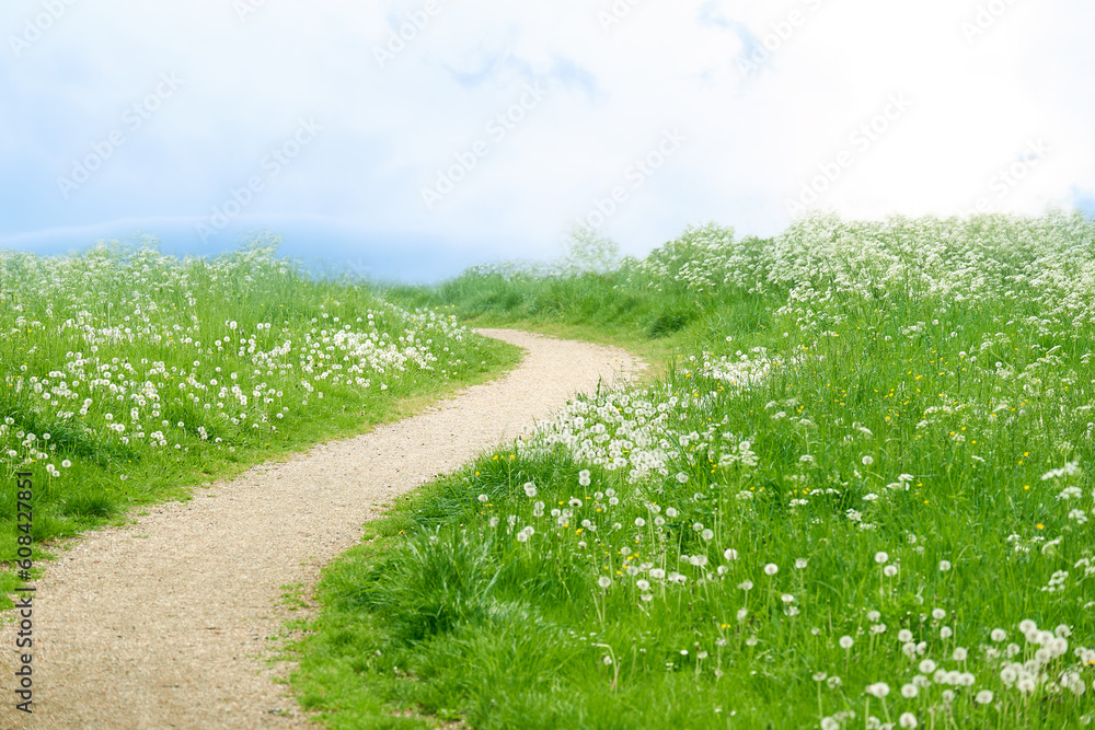 Summer landscape with, narrow winding, curvy sandy road cross green field of blooming flowers and clear blue sky