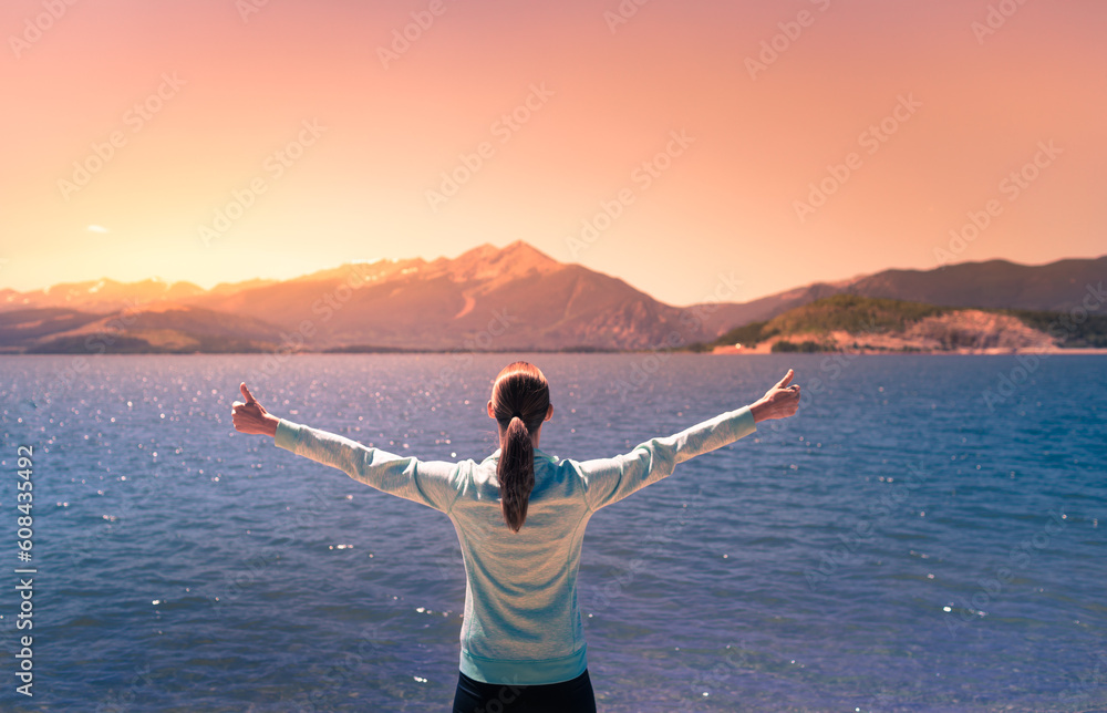 Young woman facing mountain lake sunset rejoices, smiles looking up to the sky, enjoys life and summer, nature, happiness.