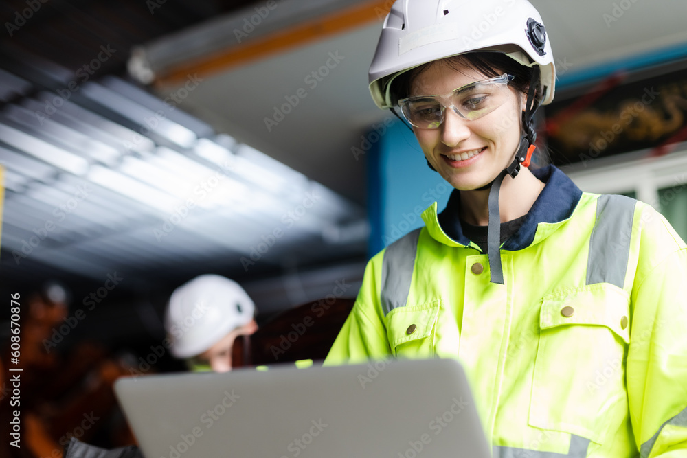 female technician engineer using laptop checking automation robotics at industrial modern factory. woman working at factory innovation automation robot.